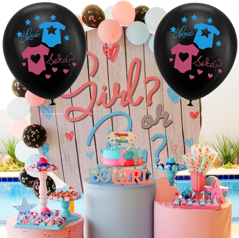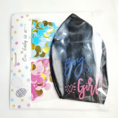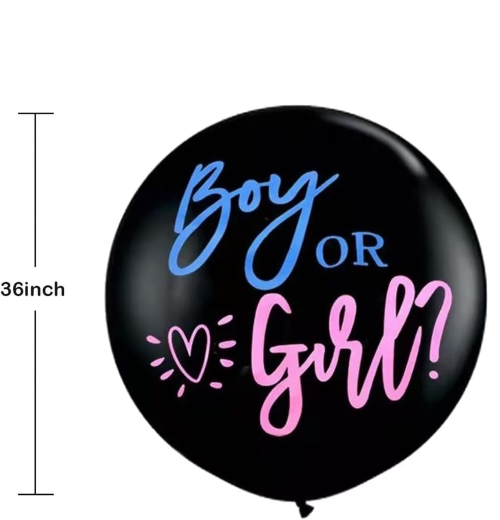ЗаБалон за откривање пола од 36 инчана залихама, мат црне је боје и има много стилова штампања, као што су дечак или девојчица, слика ликова дечака и девојчица или нешто друго везано за дечака и девојчицу. За конфете, једна кеса су конфети розе папира са конфетима у фолији златне боје, друга торба су плави папирни конфети са конфетима у фолији златне боје.