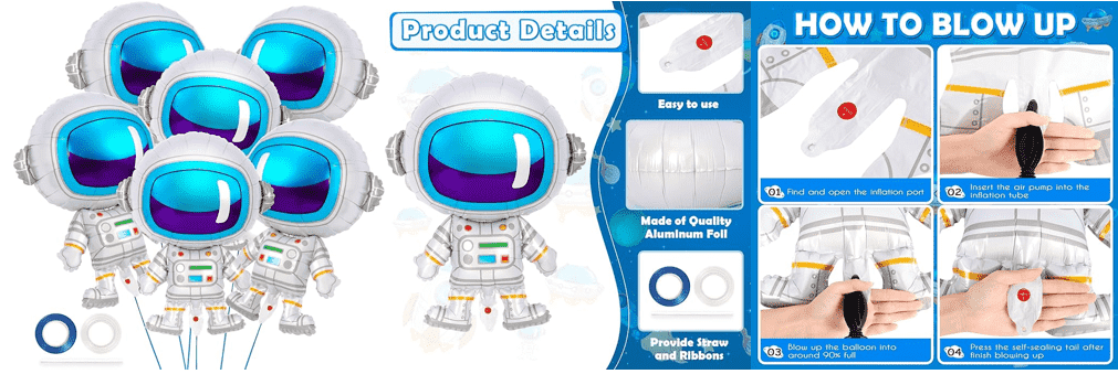 Сет балона од астронаутске фолије је мали и изврстан, згодан и лак за прављење. Поставља астронаута у центар забаве, а балон планете га окружује. Звезде вуку цвеће са обе стране без компликованих алата. Мало одело је погодно за свакодневну декорацију малих породичних рођендана и дечијих соба. То је светлосни свемирски ветар тачка уласка.