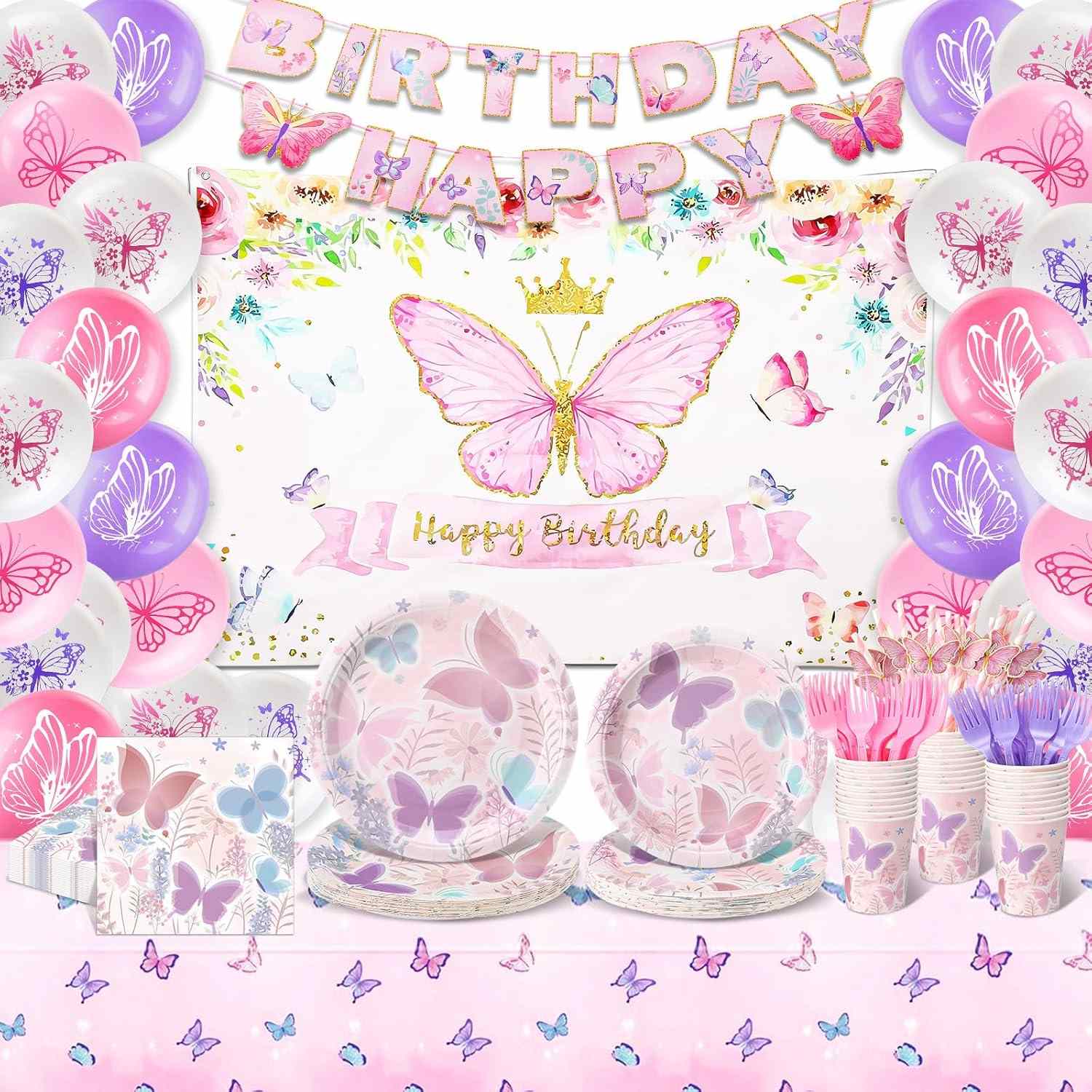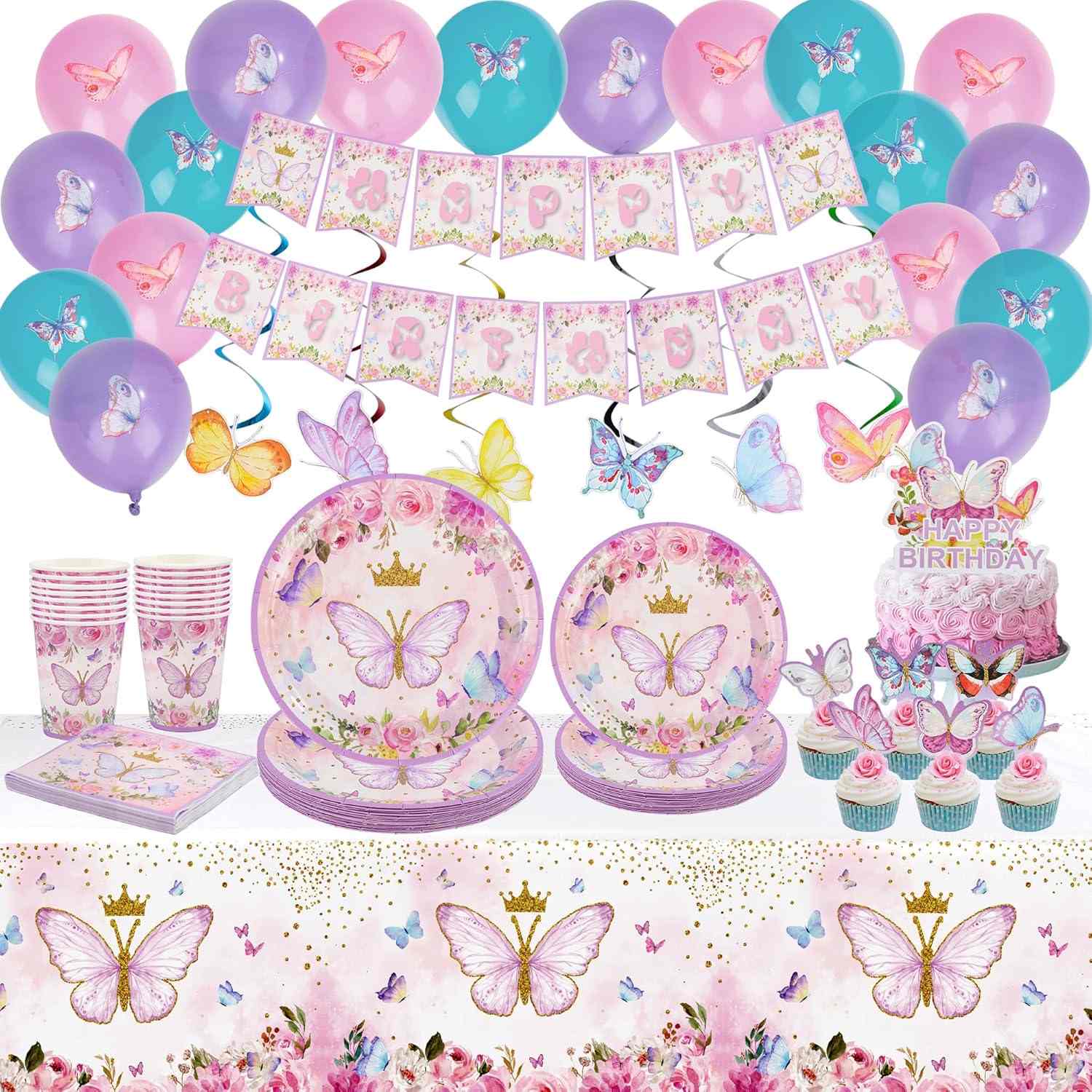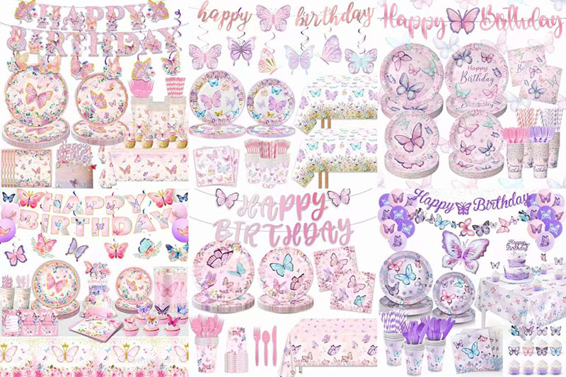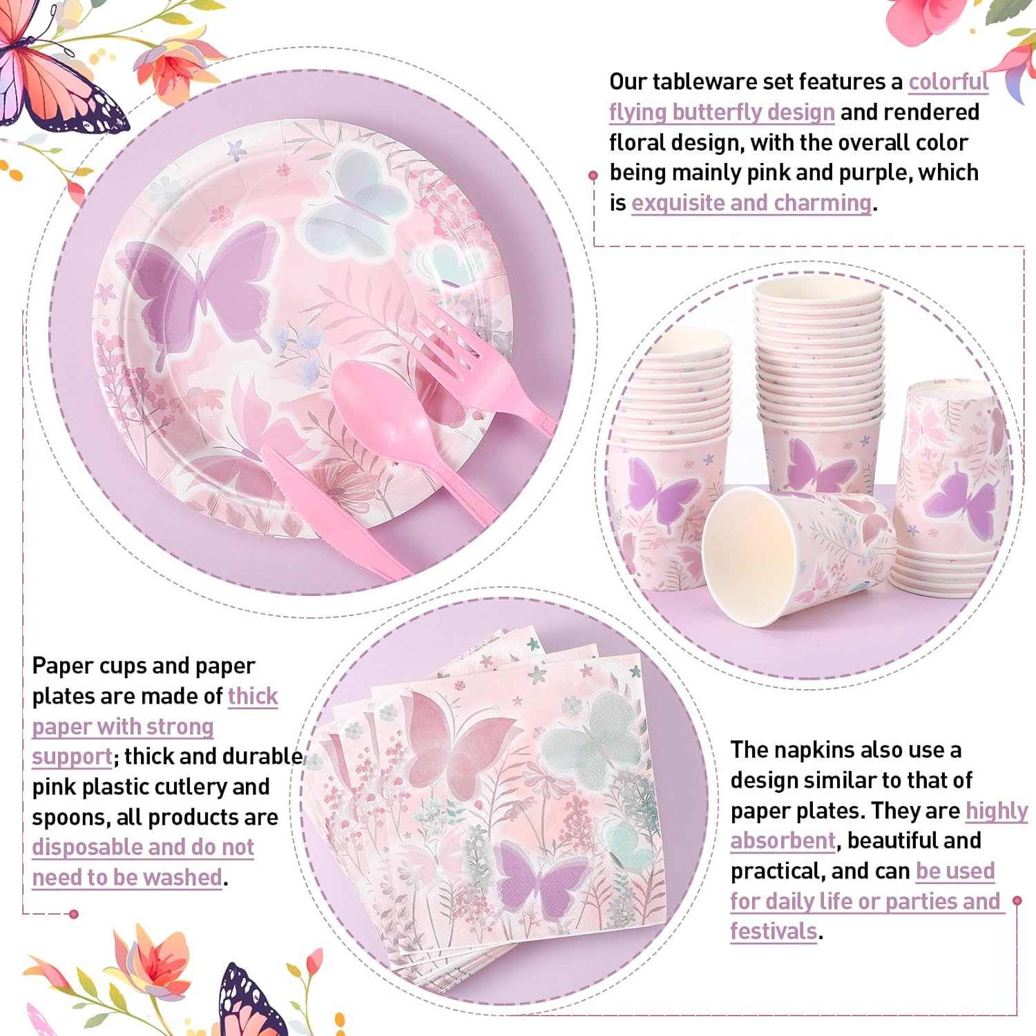 Одлична опција за декорацију забаве је сет посуђа са лептирима. Укључене су салвете, папирни тањири, папирне чаше, виљушке и ножеви. Сваки комад приказује делове лептира.
