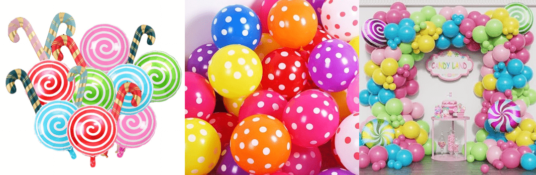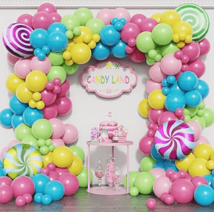 Комплет венаца од балона са темом слаткиша са бојом слаткиша из слатких снова и слатким обликом лизалице као основним елементима дизајна, укупан стил је живахан и сладак.