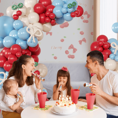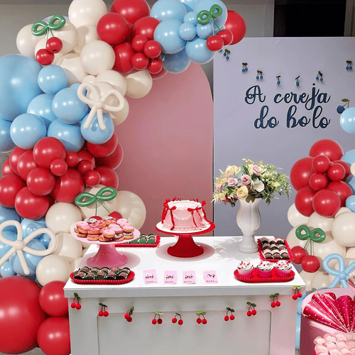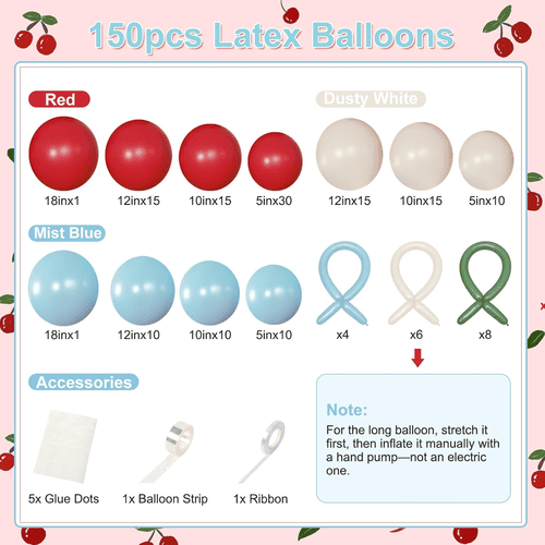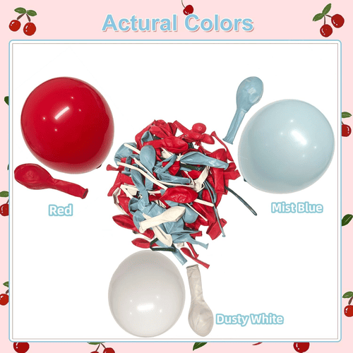 Лук балона са цветом трешње долази са разним балонима од латекса, укључујући округли латекс балон и дуги балон од латекса. Укупан стил комплета је позитиван и сладак, волели су га купци широм света. Боје округлог балона од латекса су црвене, прашњаво беле и магловито плаве. А за дуги балон од латекса је магловитоплава, прашњава бела и зелена, дуги балони од латекса се користе за прављење лептир машне и стила трешње.
