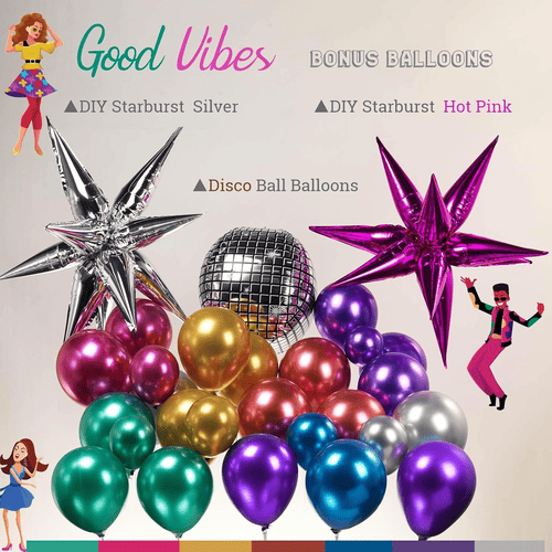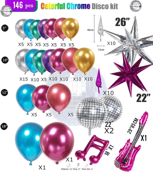 Тхедиско балон лук комплетсе углавном састоји одшарени балони од латекса иразни балони од фолије. Да бисмо направили сјајни хромирани стил, балони од латекса које нудимо су метални латекс балон, њихове површине имају веома леп металик сјај и могу постићи одличне резултате како у затвореном тако и на отвореном. Њихове величине су 5 инча, 10 инча, 12 инча и 18 инча.