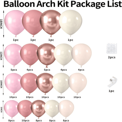 Прашњави ружичасти балон мали комплет:Овај мали комплет се састоји од 50 до 80 комада ружичастих балона. Да бисте побољшали ефекат слојевитости комплета, можете додати и беле, кајсијеве и провидне балоне. Употријебите хелијум да их попуните, а затим можете користити траку за везање и пустити их да лебде у ваздуху.