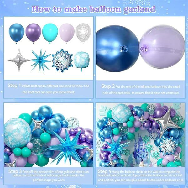 Смрзнуто украсе партије Баллоон Гарланд Кит задужено од популарног смрзнутог ИП-а. То тачно репродукује боје из филма. Комбинује хладне боје попут плаве, сребрне, љубичасте и беле боје. Плава је попут раног јутра неба Арендела. Светло љубичаста је попут сјаја који се препуним чаробним леденим кристалима. Сребрно украси су попут одраз пахуљица. Они граде систем боја са богатим слојевима. Они стварају сан и елегантно визуелно искуство.