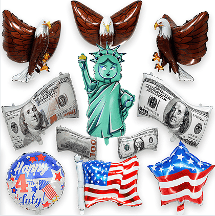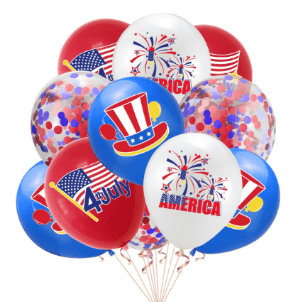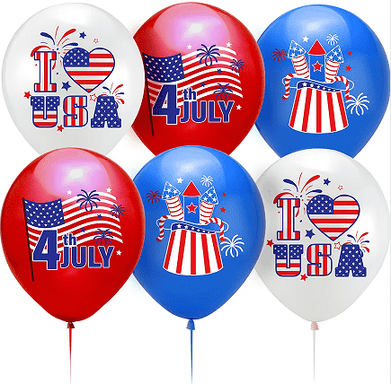 Могу се више пута надувати, узимајући у обзир и изводљивост и заштиту животне средине. У процесу декорације додали смо разне посебне елементе празничне декорације. Балони од латекса су одштампани изузетним звездастим пругама, шарама петокраке и енглеским речима „Срећан 4. јул“. Балони од фолије се користе за креирање класичних облика за Дан независности као што су тродимензионалне звездне пруге, ћелав орао и број "4". Неки балони су такође додани блиц елементима као што су златни прах и шљокице како би ефекат декорације био привлачнији.