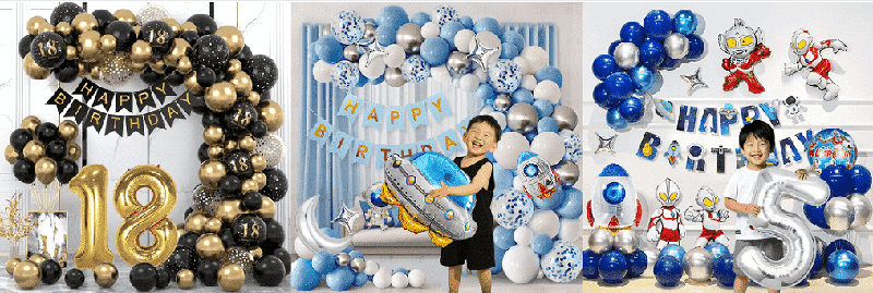 Основни стил је Хаппи Биртхдаи латекс балон у истој или комплементарној боји, саСрећан рођендан писмо балони од фолијеилиброј балона од фолије. Класични стилови имају макарон пудер гел балон розе Хаппи Биртхдаи фолијски балон, црни балон од латекса са златним балоном од фолије. Балони од латекса се могу нанизати у ланац балона и окачити на зид или плафон, са балонима од фолије као визуелним средиштем и малом количином украса траке за брзо стварање једноставне и текстуриране атмосфере за забаву.