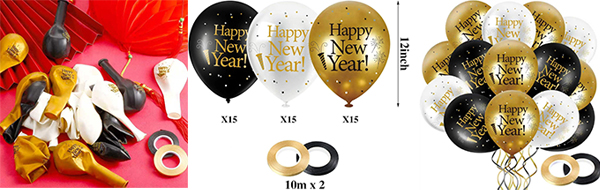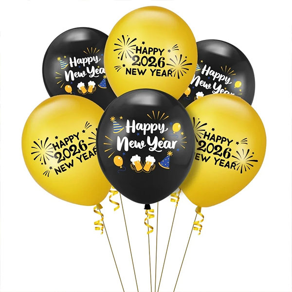 Новогодишње латекс куглице су украсни балони доступни у сетовима, са новогодишњим дизајном попут „Срећна Нова година“ или свечаним бојама попут црне, златне и сребрне. Савршени су за забаве и могу се користити за прављење лукова од балона, букета или окачених са плафона. Све новогодишње латекс куглице које нуди Борун Баллоон Фацтори су у потпуности направљене од латекса и испуњавају Хаппи Нев Парти Латек Баллоонс ЦЕ сертификат. Бренд ниун подржава велепродају ових новогодишњих латекс балона. Ове латекс лопте за срећну Нову годину су и практичне и естетски угодне, нудећи и економичан и креативан дизајн. Они моментално подижу празничну атмосферу и уносе топлину и радост у било коју прославу.