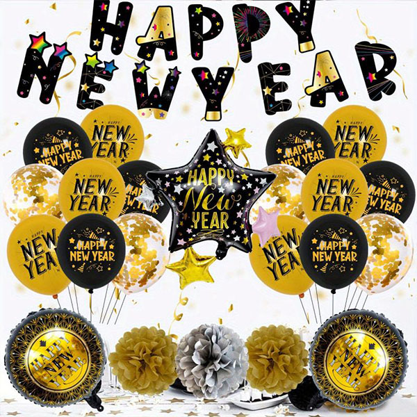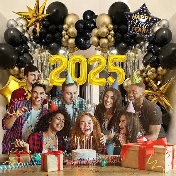Балони са новогодишњим темама су суштински део празничног декора. Ови живописни балони, у црној и златној боји, стварају јединствен празнични штих, уносећи радост и стил у новогодишњу атмосферу. Њихова издржљива текстура је отпорна на дефлацију, омогућавајући им да остану пуни током дужег периода. Могу се надувати сахелијум или ваздух, одржавајући пун, тродимензионални изглед. Савршени су за унутрашњу и спољашњу декорацију.