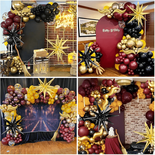 Балон од латекса у луку балона са темом Хари Потера направљен је од 100% сировог латекса који се увози из југоисточне Азије. Пошто су природни материјали, потпуно су еколошки прихватљиви и безопасни за децу и одрасле. Њихове боје су симболичне боје филмова о Харију Потеру, укључујући винско црвену, жуту, црну и златну. Да бисмо додали више слојева, додали смо и балон са конфетима, конфети су металик злата.