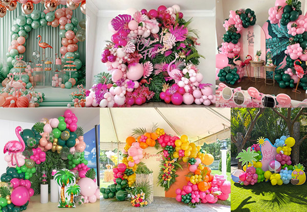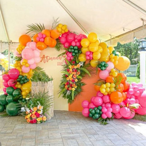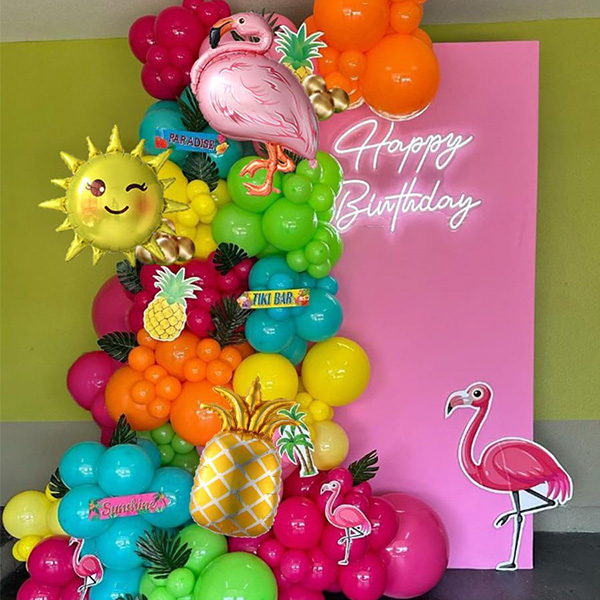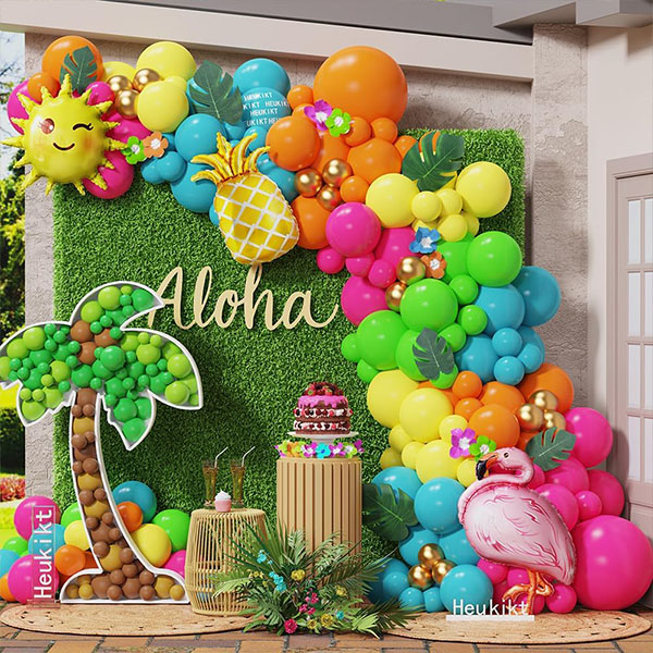 Можемо га прилагодити вашој теми, бирајући вашу сопствену јединствену палету боја. На пример, додавање балона са ретро темом створиће тропску и свечану атмосферу за ваш простор, додајући дашак гламура вашем хавајском комплету гарланда од балона.