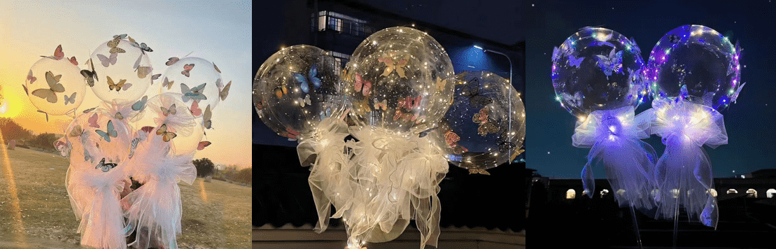 Сам балон Бобо је транспарентан и једноставан, који је веома у складу са флексибилношћу преносе светлости шупље наљепнице лептира. Основна употреба наљепнице је да надоградите монотони балон у балон за суспензију лептира и направите балон фокус сцене кроз тродимензионални облик лептира и ефекта светлости и ефекта светлости и ефекта светлости и ефекта свјетлости и ефекта свјетлости и ефекта свјетлости и ефекта свјетлости и ефекта свјетлости и ефекта сјене. Дечија рођенданска забава, странка за рођендан за одрасле, подручје добродошлице на венчаници, активности тржног центра, декорација кућног простора је врло погодна. Ноћу се такође може ускладити са ЛЕД лампицама, што је веома привлачно.