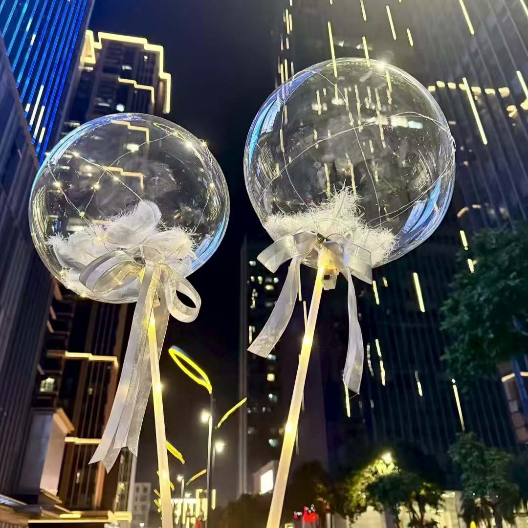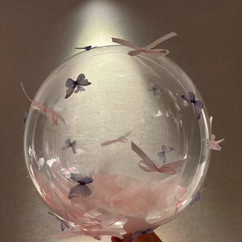 Кина ЛЕД феатхер-испуњена боболом бобо-апрекида се од традиционалних дизајна балона, користећи аТранспарент Бобо балонкао "контејнер". Има шарене перје или једно обојене перје унутра, упарене са скривеном ЛЕД светлосном траком (доступно у сталној, трепћеној и другим начинима). Баллон се надувава. Постаје округли и пун. Јасно показује живахно изглед перја. Дању је. Природне боје перја мешају се са светлошћу и сенком. Додају мекани и елегантан осећај на сцену. Ноћно је. ЛЕД светлосне траке укључују. Перје је прекривено сјајем. Они стварају чаробно расположење. Купци могу слободно одабрати боје пера. Они се налазе на основу онога што је сцене потребан. На пример, романтичне теме венчања могу да користе ружичасте и беле перје. Дечија странака могу користити мешовите перје обојене дуге. Ово помаже да изазива машту и забаву.