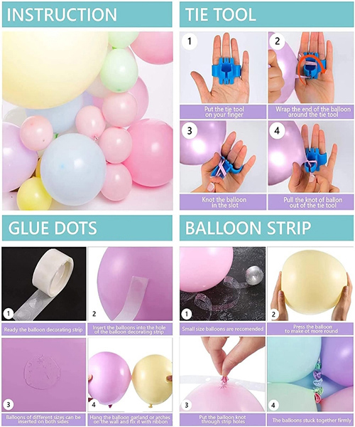 Извадите одговарајуће бодове балона у макаронском сладоледу балон Арцх Гарланд Кит и залепите бодове на одговарајућим положајима два балона тако да се два балона могу налепшати заједно. Фабрика Баллоон Ниун® користи транспарентне неозначене бодове за лепљење како би се осигурала природна веза између балона након Скупштине.
