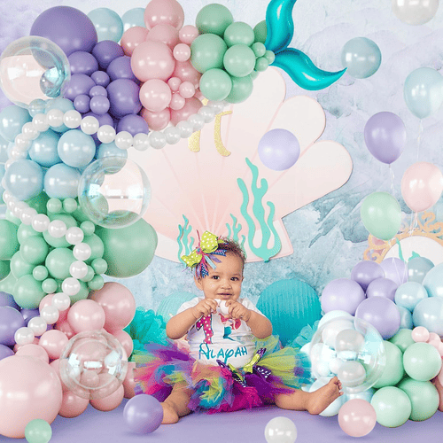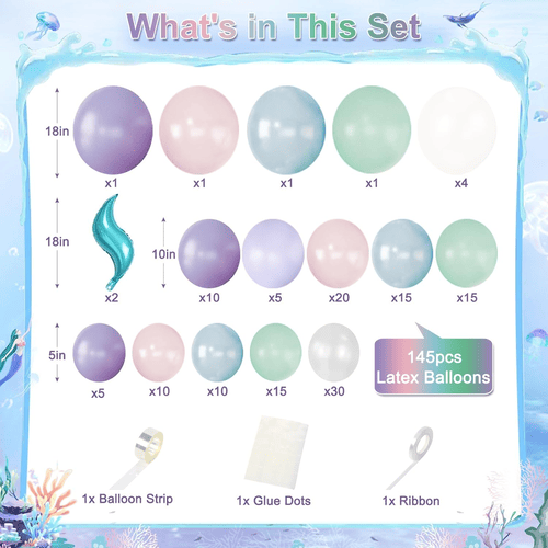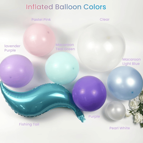 Балони у Мермаид балон вијенцу долазе у више боја, као што су љубичаста, лаванда, пастелно розе, светло плава, теал зелена, бисерно бела и провидна, заједно са украсима репа сирене од фолије, што га чини одличним за креирање магичне забаве на тему морске сирене.