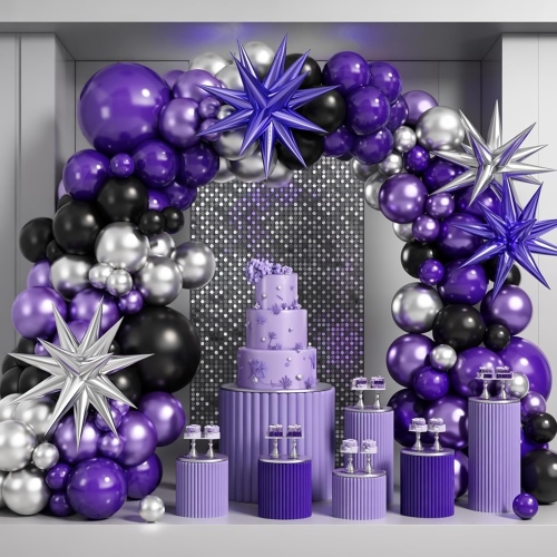 Љубичасти и црни сетови вијенаца од балона су један од најпопуларнијих стилова у нашим комплетима вијенаца од балона. Венац са луком од балона укључује5 инча, 10 инча и 18 инча мат љубичасти балони, 5 инча, 10 инча и 18 инча мат црни балони,10-инчни металик сребрни балони, 12-инчни сребрни конфети балони и додаци за балоне који лепе тачке, ланац балона, траку и тако даље.