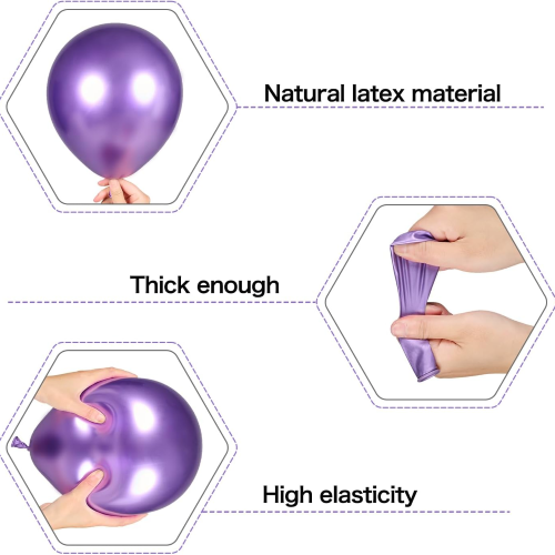 Наши љубичасти и црни балони су направљени од природног латекса. Једном надувани, балони имају пун, пун облик и није их лако распрснути. Одликују се светлим и живим бојама. Наши балони су прошли тестове као што су ЕН71, ЦПЦ и ЦЕ. Безбедни су и нетоксични, што их чини погодним за игру деце. Могу се продавати у разним земљама.