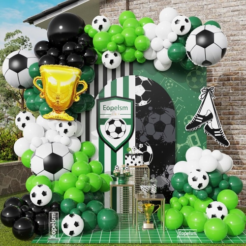 Комплети укључују 12 инча тамно зелене бојелатекс балони, 12-инчни црни латекс балони, 12-инчни зелени латекс балони са конфетима, 12-инчни металик сребрни латекс балони, 12-инчни балони од латекса за фудбалску штампу, балони од фудбалске фолије, балони од звездане фолије, папирни банер за срећан рођендан, цвеће од папирних лоптица и додаци као што су траке од лепка и додаци.