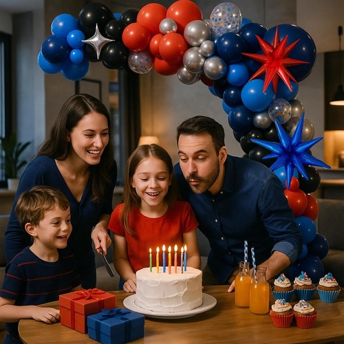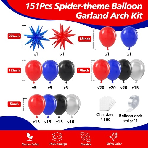Главне боје сета балона су плава, црвена и црна. Препознатљиве три боје ће вас натерати да замислите кул фигуру Спајдермена из филма. Балони од латекса у овом сету укључују мат црвени балон, мат плави балон, мат црни балон, металик балон у облику црног балона. Фолијски балон у овом сету је балон од фолије у облику звезде експлозије, боје је плава и црвена.