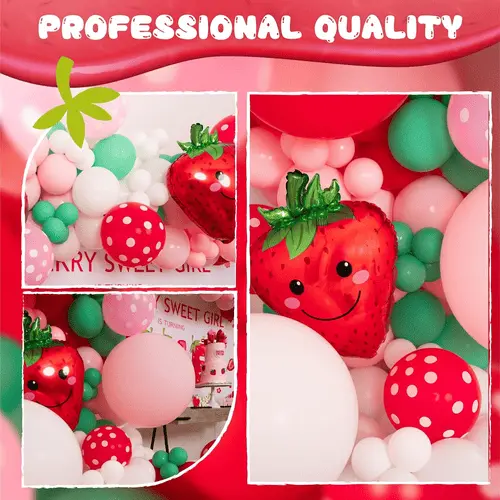 Балон вијенац са темом јагоде састоји се од висококвалитетног балона од латекса и балона од фолије. Најистакнутији предмет у комплету је балон од фолије од јагоде од 27 инча. Поред тога, важан део су и балони од латекса који се налазе у њему. Балони од латекса у комплету су различитих боја и величина, што може створити прелепе слојеве. Боја балона од латекса је макарон розе, мат црвена, мат тамно розе, ретро слоноваче бела.
