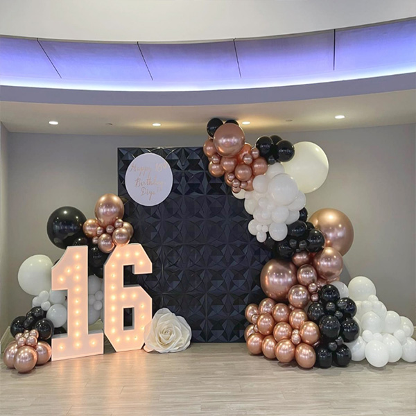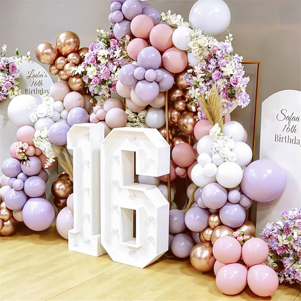 Венац од балона са 16 лед светла:Наша фабрика је такође лансирала балон гирланду са лед светлом старом 16 година. ЛЕД бројчана светла су направљена од еколошки прихватљивих материјала АБС и ЛЕД да би обезбедили светле и трајне светлосне ефекте. ЛЕД светла са бројевима и словима која могу да светле у мраку. Меко осветљење ствара опуштену и удобну атмосферу и додаје јединствен шарм свакој просторији. Могу се поставити самостално или окачити на зид, на камину или поставити у простор за пријем за употребу током догађаја или прослава. ЛЕД бројчана светла са луковима од балона, погодна за стварање импресивне атмосфере на забави, представљају суштински реквизит за снимање јединствених и незаборавних фотографија, додајући незабораван осећај церемоније вашем 16. рођендану.