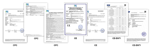 Наш комплетан асортиман производа је прошао ЦПЦ, ЦЕ, ЕН71 и друге ауторитативне сертификате, у строгој сагласности са европским и америчким и другим прописима о безбедности циљног тржишта. Ове квалификације могу помоћи вашој роби да несметано царини и потпуно избегне ризике усклађености на иностраним тржиштима.