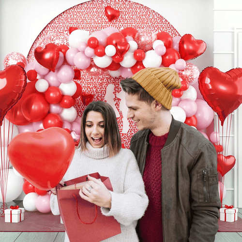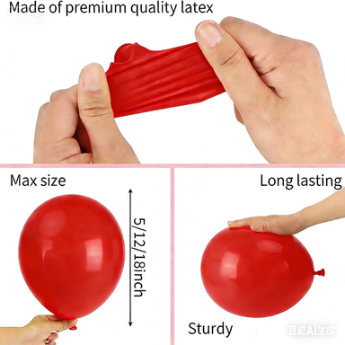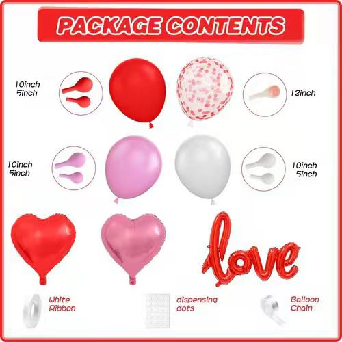 Овај комплет балона се углавном састоји одлатекс балонии неколикобалон од фолије. Њихови балони од латекса су црвене, розе, беле боје. Направљене су од 100% природног латекса, који је потпуно еколошки прихватљив и безопасан за људски организам. И њихова величина је такође различита. Да би се поставио леп слој, величине балона од латекса су од 5 инча до 12 инча. Ређати их у сет је врло лако, са њим припремамо и лепак за тачке и ланац од балона. Дакле, док га уређујете, можете то учинити флексибилно.