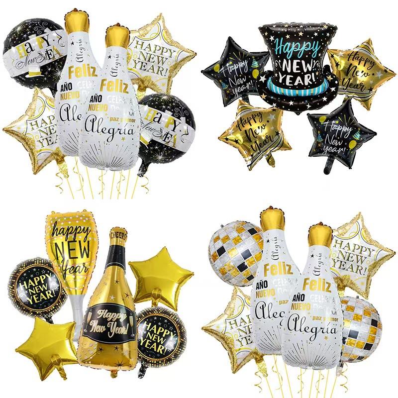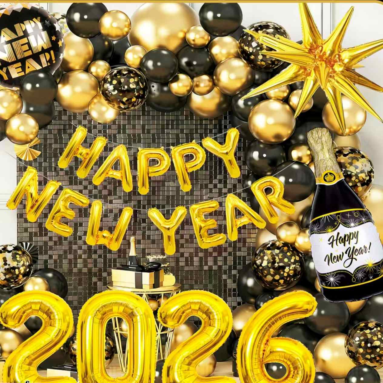 Размислите о комплету на тему Нове године. Има балоне од фолије који изгледају као боце шампањца. Такође укључује балоне са бројевима "2026", украсне балоне са звездама и још много тога. Главне боје су црно-златна или златно-бела. Пун је новогодишњег празничног весеља. Лако може направити луксузну и церемонијалну сцену новогодишње забаве.